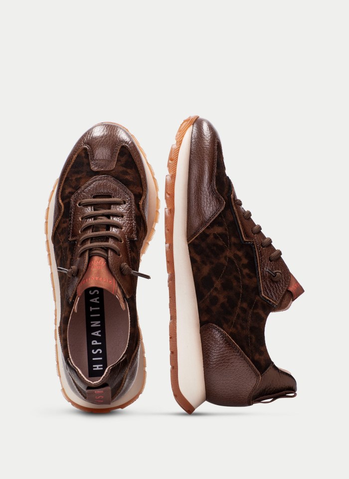 Elaborado en piel combinada con serraje de estampado animal.