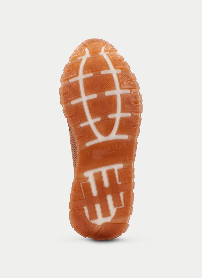 Fabricado en piel combinada con tejidos de rejilla. 73% de poliéster reciclado.