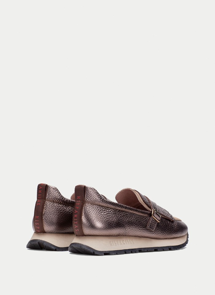 Mocasín deportivo slip on con detalle de antifaz, flecos y hebilla tipo monk strap en el empeine.